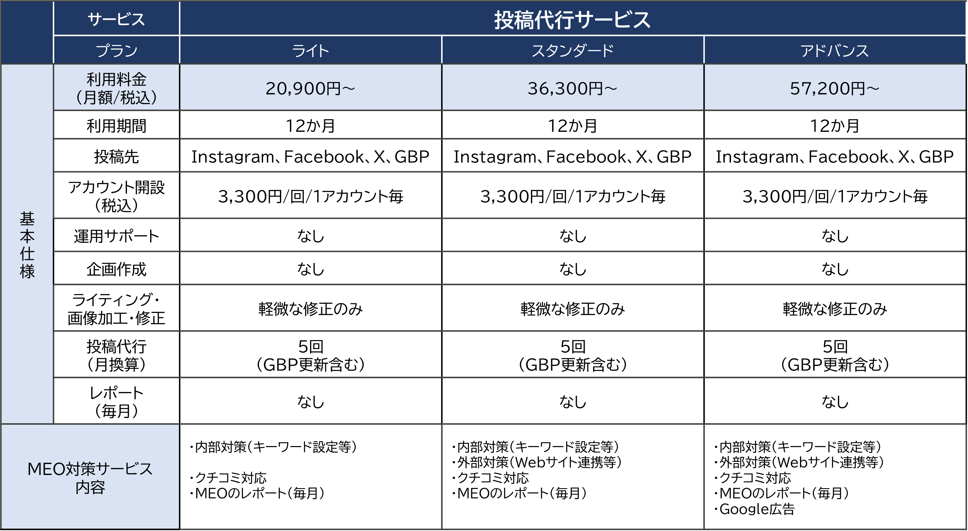 ※上記利用料金でMEO対策サービスと投稿代行サービスを行います。