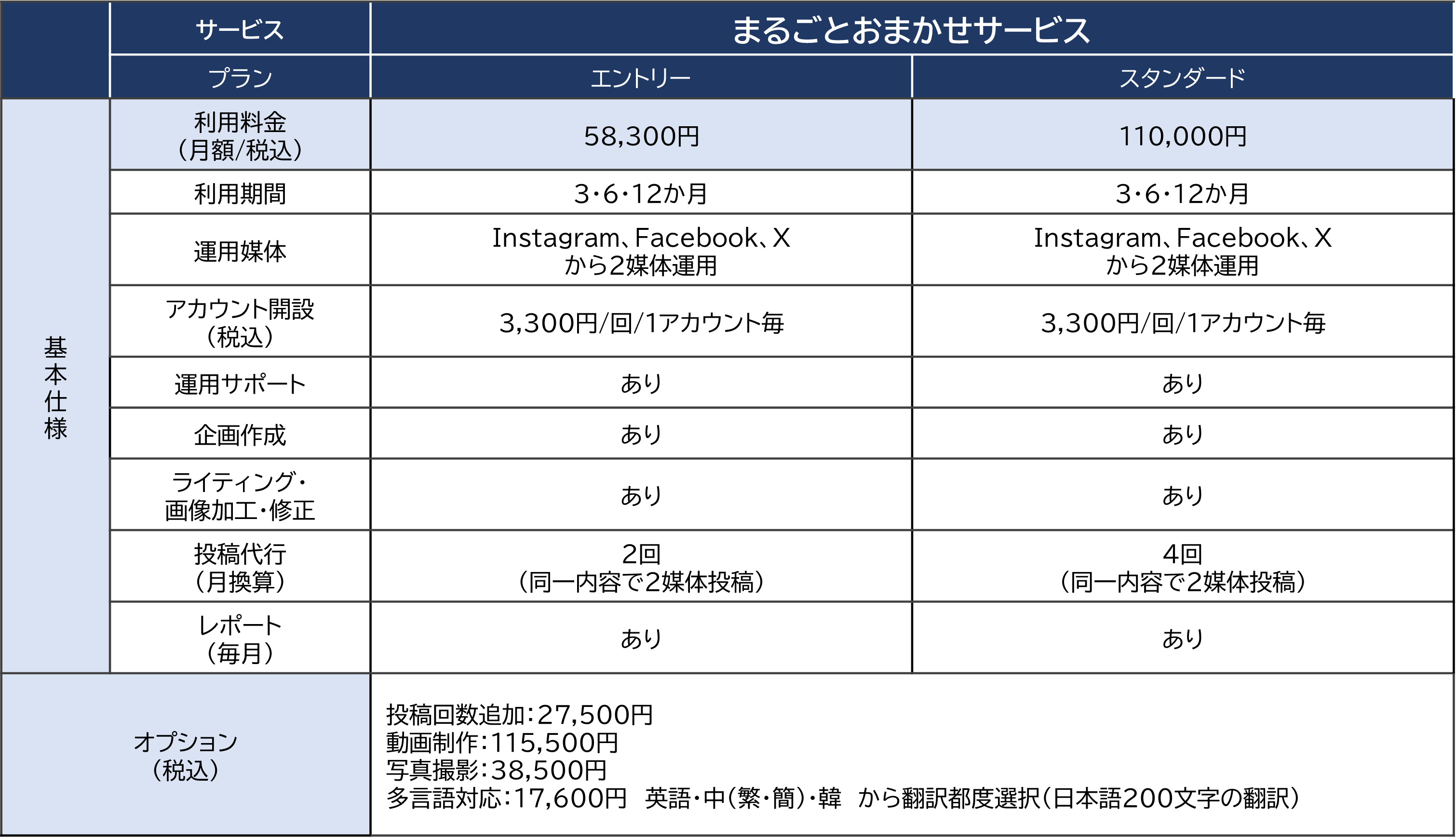 ③ まるごとおまかせサービスはInstagram、Facebook、Xから2媒体運用を行い58,300円/月(税込)からご提供、投稿回数追加、動画制作、写真撮影、多言語対応などのオプション充実